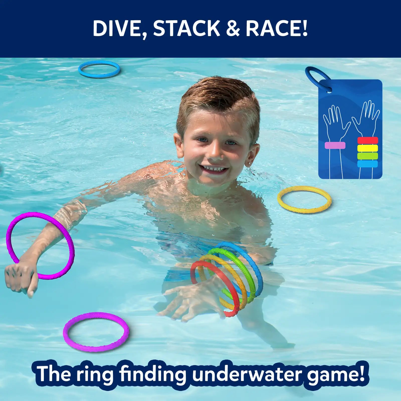 Memorize the card and dive into the pool to find the right colored rings. Swim as fast as you can to grab and stack 'em in the correct order around your arms, and be the first to bolt back up to win a point! The first to win 5 points is the RING RUSH champion!